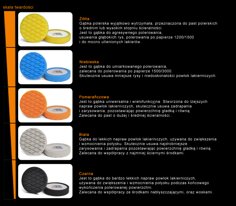 Przeznaczone do polerowania lakierowanych powłok różnego typu. Charakteryzują się wysoką jakością i profesjonalnym wykonaniem, wyprodukowano je z precyzyjnie dobranych trwałych materiałów o wysokiej jakości.